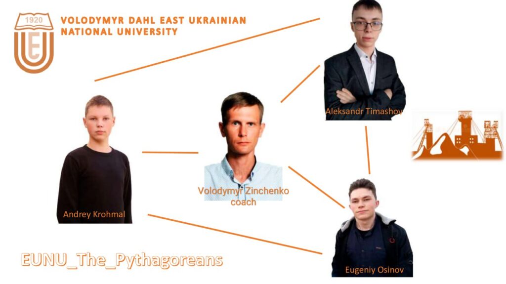 Congratulations to the EUNU_The_Pyphagoreans team consisting of Andrii Krokhmal, Yevhen Osinov, Oleksandr Timashov, as well as coach Volodymyr Zinchenko on this achievement! We wish you lots of interesting ideas, effective algorithms for implementing everything planned, error-free codes, easy sprints and interest in your favorite business! And in life, be programmed exclusively for success and happiness!